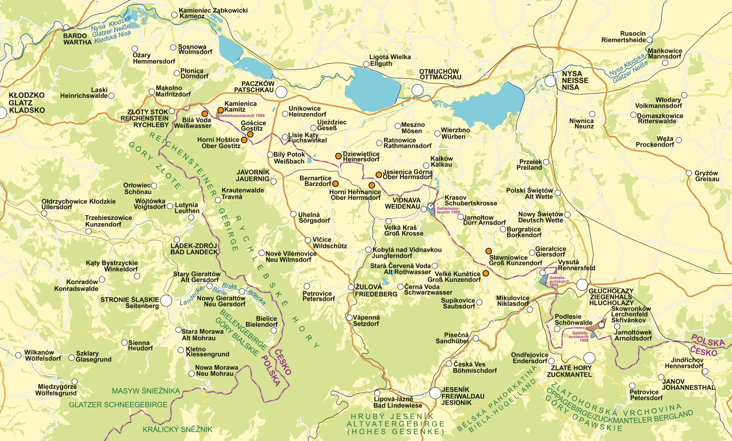 Schon ein flüchtiger Blick auf die Karte des Jauerniger Zipfels beweist, dass in dieser Gegend Nachbarschaft im wahrsten Sinne des Wortes gelebt wird. Denn auf einer Strecke von 30 Kilometern gibt es mehrere Ortschaften, die durch die Staatsgrenze geteilt oder zusammengewachsen sind, obwohl sie sich in zwei verschiedenen Ländern befinden. Zur ersten Gruppe gehören Gostitz/tschech. Teil Horní Hoštice/poln. Teil Gościce, Ober Hermsdorf/tschech. Teil Horní Heřmanice/poln. Teil Jasienica Górna und Groß Kunzendorf/tschech. Teil Velké Kunětice/poln. Teil Sławniowice. Zur zweiten Gruppe zählen Weißwasser/tschech. Bílá Voda und Kamitz/poln. Kamienica sowie Barzdorf/tschech. Bernartice und Heinersdorf/poln. Dziewiętlice.